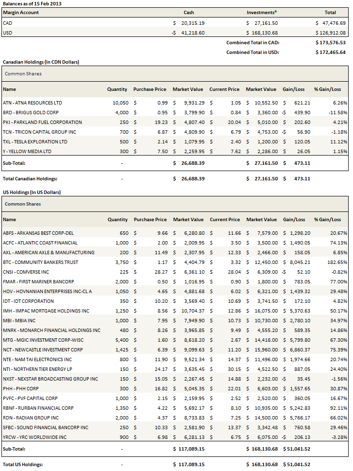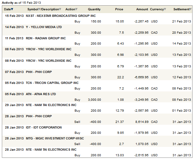 In the cases of both Tricon Capital and YRC Worldwide my additions came after recent events confirmed my opinion. I like to initiate a starter position in a company and then add to that position if the company performance confirms my expectation. In the case of YRC Worldwide it was a solid fourth quarter while with Tricon Capital it was the purchase of residential real estate in Charlotte.