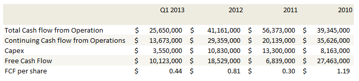 Note that I have updated this table from the original post to distinguish the total reported cash flow from operations versus the cash flow from continuing operations.  In my estimate of cash flow from continuing operations I tried to eliminate all one time items that impacted cash.  The free cash flow estimate is based on the continuing cash flow from operations: