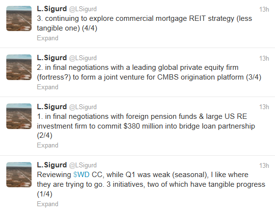 Walker & Dunlop reported a weak first quarter and the market punished the stock for that on Wednesday. But there were a lot of interesting comments made on the conference call, and I referenced some of the highlights in the following tweet show this morning (you will want to read it from the bottom up).