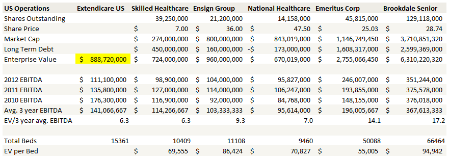 Extendicare’s US operation enterprise value, which is highlighted in yellow, is based on the lowest EV/EBITDA of its competitors. This is conservative, but perhaps not as much as it seems because Skilled Healthcare looks to be the company with the closest comparables to Extendicare.