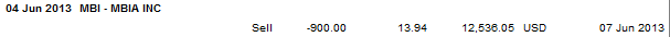 I sold out of MBIA because there is no immediate and clear catalyst. The stock never really approached the level I would have expected it to once the Bank of America settlement arrived. Based on the settlement I expected $18-$20 and the stock only briefly traded above $16. As the weeks passed by it became clear that the market had no intention of revaluing MBIA to its adjusted book value (which is above $30 per share) without further evidence of a viable, ongoing business.