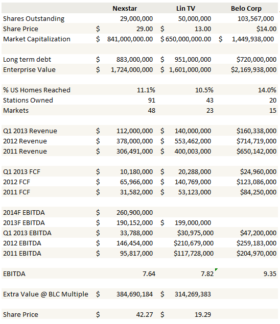 Based on the metrics of the Belo/Gannett transaction, a spreadsheet I made at the time I purchased LIN TV suggested it was significantly undervalued versus the transaction, and even now it remains somewhat undervalued. I have reposted that spreadsheet below. Note that I have left in the original share prices of each company from June when I did the work. With both LIN TV and Nexstar, my EBITDA estimates had to be based off of forecast numbers (which I’ve taken from brokerages that cover the stocks) because both companies have had significant accretive acquisitions so their past performance doesn’t reflect what earnings will be like going forward.