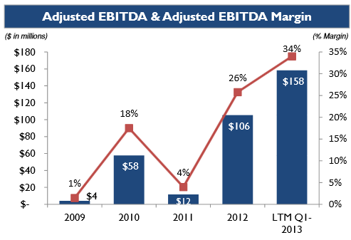 The chart below shows the company’s adjusted EBITDA for the last 3 years and the trailing twelve month period (from the May presentation). Adjusted EBITDA, which ignores one-time and non-cash charges like stock options, has historically been a good representation of operating cash flow for the company after you adjust it for interest costs, which are about $7 million per quarter (coming from $350 million of 7.5% senior notes).