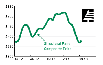 At higher OSB prices such as those realized in the first quarter, Ainsworth would be netting free cash flow of about $52 million per quarter. That would make the current enterprise value about 5x its free cash flow. Of course OSB prices have dropped significantly from their highs and are currently at $270/msf. I haven’t been able to find a good historical chart of OSB prices that I can put up (Madison’s does put a historical chart up periodically but you have to make a copy of it because they refresh which charts on a weekly basis and I’m not quick enough for that) but below I’ve included a structural panel composite price index (from randomlengths.com) that includes both OSB and plywood. You can get a sense from it the trajectory over prices over the last few months.