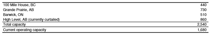 Ainsworth produces oriented strandboard (OSB), which is mainly used in residential housing. The company has mills (I’ve stated the capacity in brackets) in Grande Prairie (730mmsf), Hundred Mile House (440mmsf), Barwick Ont (510 mmsf), and they are bringing on-line a mill in High Level Alberta (860 mmsf) in the third quarter.