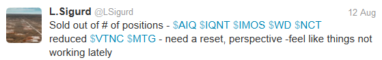 My portfolio is down about 5% from its highs in mid-July. The toughest thing to do after a quick drawdown like this is to admit that things are wrong and take money off the table. You just want to get back up to the highs and then call it a day. Of course this is a fantasy, if my portfolio rallied back 5% my outlook would be entirely different, and I would probably be looking for ways of adding risk rather than mitigating it.