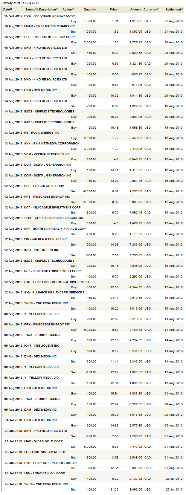 While I’ve had my share of winners over the past month and a half (AIQ, NVS, NCT, NRF, IQNT to name a few), I’ve also had my share of losers (NKO, EXE, VTNC, and the above mentioned duo) with the result being that my portfolio has done not much of anything. While I remain hopeful that both Niko Resources and Extendicare eventually pan out, the fact is that thus far they haven’t.