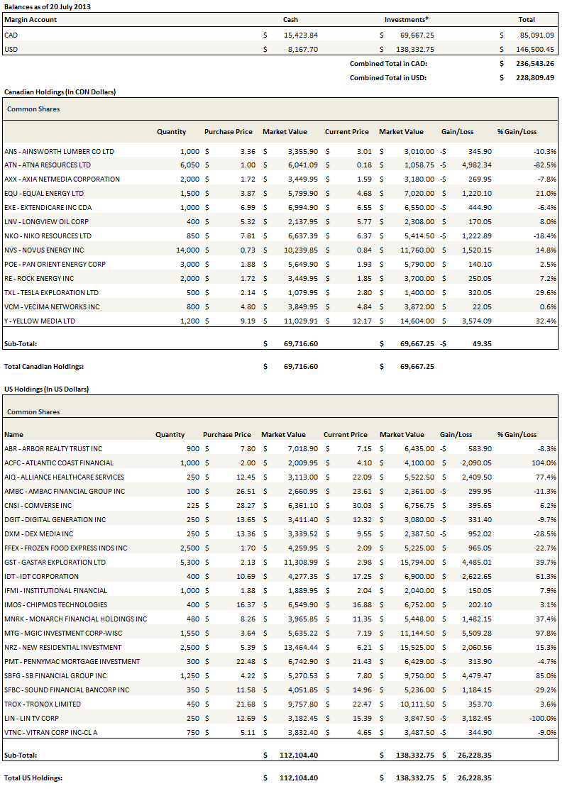 These were stocks I had sold in my real portfolio the prior week, and had tweeted as such, but as sometimes happens, I didn’t make the trade in the practice portfolio. Other sales in the last month were Northstar Realty (thankfully before the share offering), what was left of YRC Worldwide (thankfully before the second quarter results), a significant reduction in my position in Dex Media (brought upon simply by the fact that I have been horribly wrong) and the sale of First Mariner Bancorp, which has been a great little stock for me (more than tripled since I bought) but has had trouble posting profits as mortgage refinancings dry up and still has unresolved issues with TrUPs securities that will come due at year end.