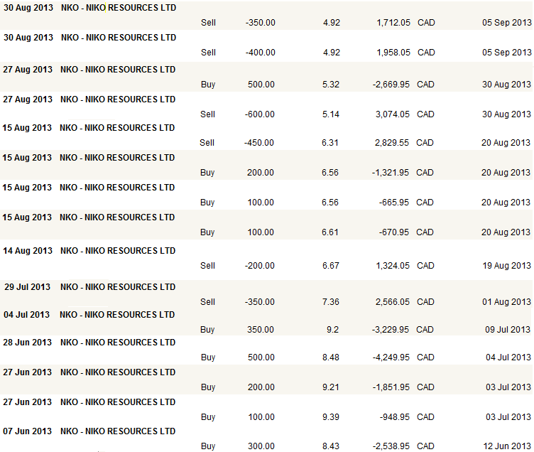 Such is the case study of Niko Resources (NKO.to), which I want to spend a few minutes on here. Below is the trading history from my practice account that I track on this blog. My actual trades of the stock followed the pattern shown here is fairly close fashion.