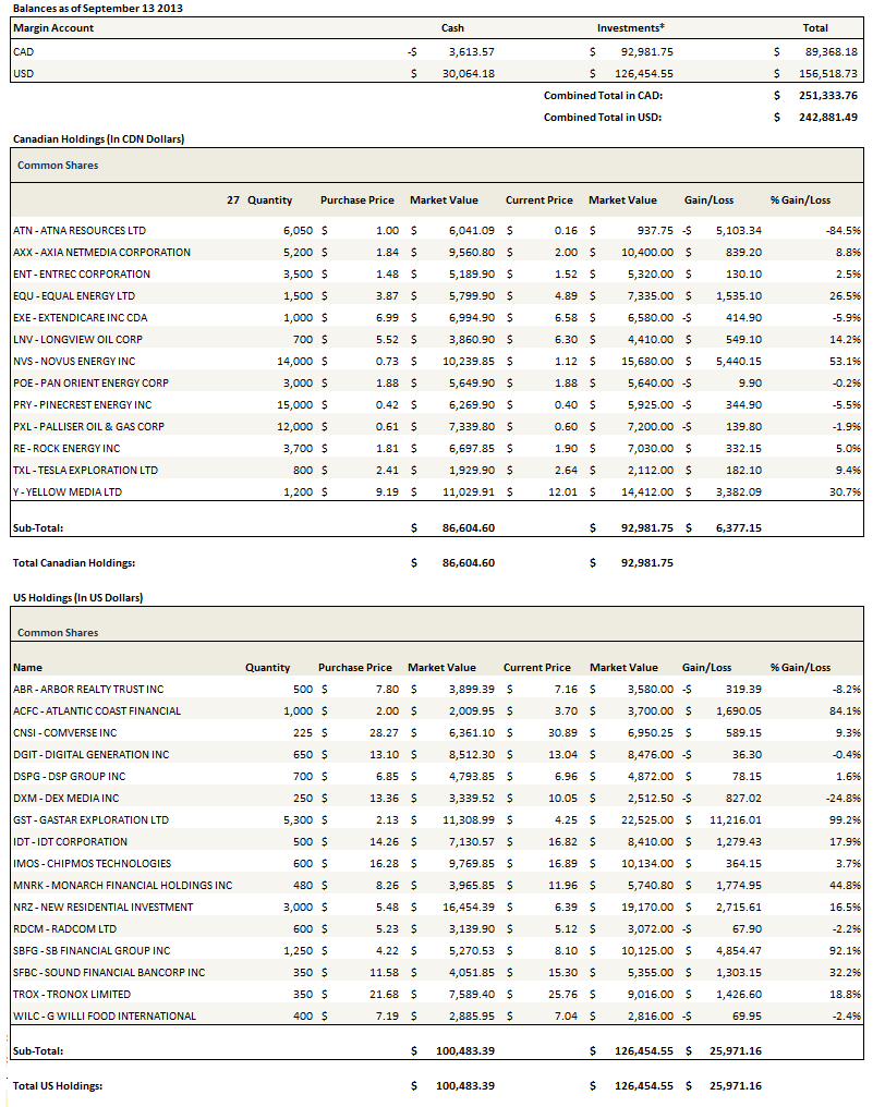 I ended the month on a high note, at a new all-time high after gains this week from Gastar, Tronox, and Entrec, and notable gains over the last month from Axia, Novus, Ainsworth, Equal and Monarch Financial.