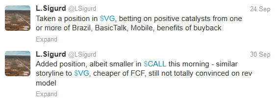 The only two new positions I want to mention quickly are Vonage (VG) and MagicJack (CALL). I bought both stocks in late September. I’m in the process of writing a more detailed post, which I was hoping to have finished by now but there have been a lot of things going on that have limited my writing time of late, so I will leave out most of the details until then. At the time I added the stocks I tweeted the following: