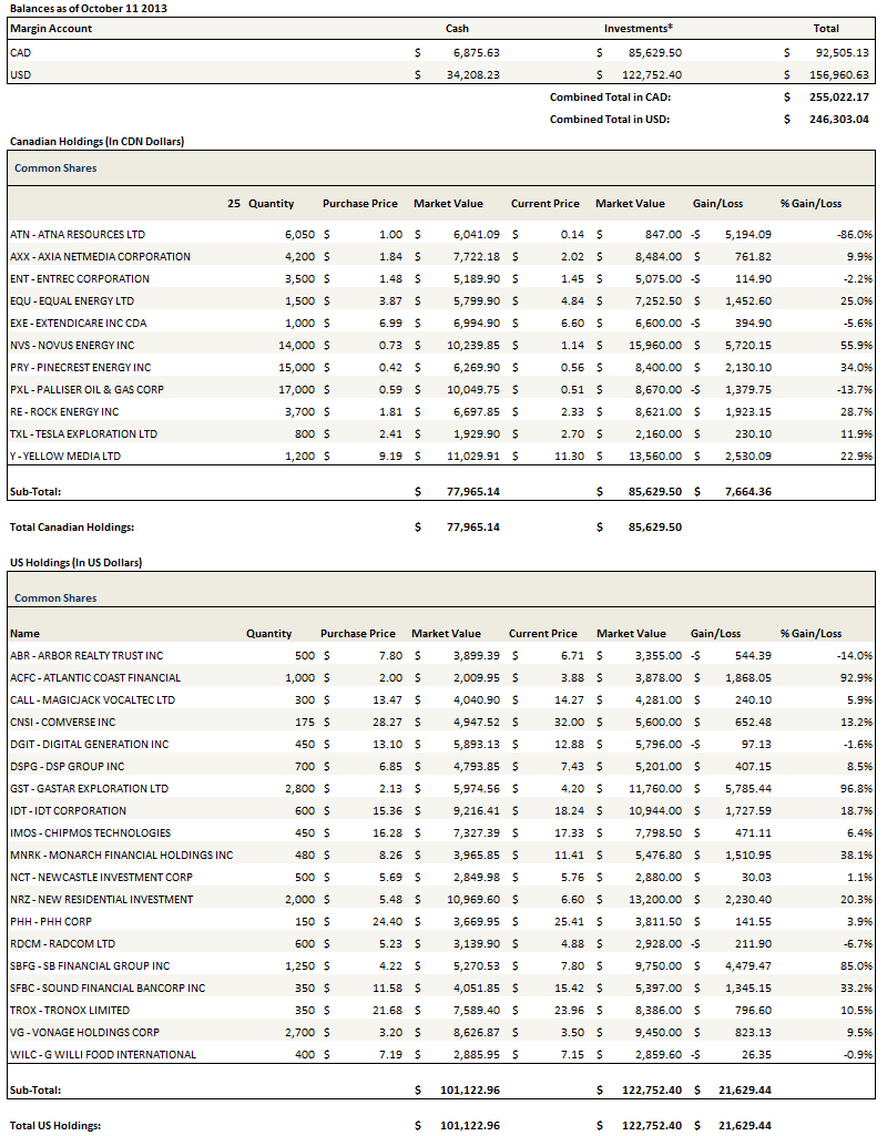 Nevertheless, the tangible evidence is that my portfolio has recovered and made new highs in the last month. I had a blip to the downside in August, and when I look back on that blip, I can attribute it to a few bad decisions. There was Niko Resources, Walker and Dunlop and Dex Media obviously and to a lesser extent Vitran and AMBAC. All of these stocks had flaws that I should have recognized and gave greater consideration to, and none of these stocks deserved to be allocated outsized starter positions, yet in the case of Niko and Dex Media that is exactly what I did.