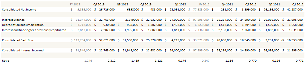 I didn’t, however, put in any new work before my purchase. I took the lazy way out, falling back on the thesis of choppy but improving fundamentals of the housing market and my work from nine months earlier that suggested that by 2014 Hovnanian should cross the fixed interest coverage restriction that has kept them from paying interest on their preferreds.
