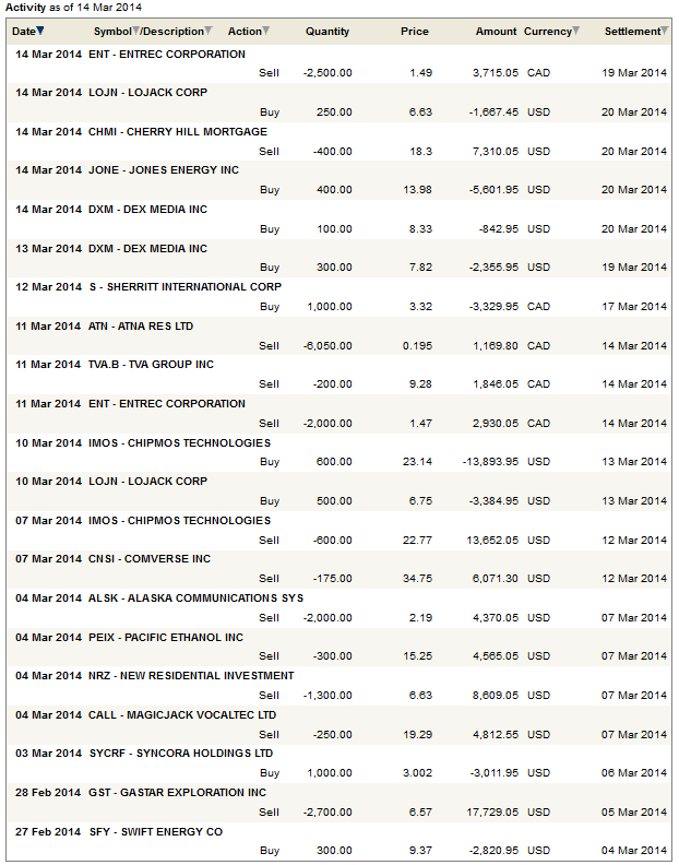 With that said, the names that I am currently of the heaviest weight are, of course, Pacific Ethanol, which remains my largest position by far (the weighting in the on-line portfolio I track here actually understates my true exposure as I have not always been diligent in matching my purchases); MagicJack, which has remained roughly the same size over the past few months; Sherritt, a position which I reduced after earnings but have subsequently added to as the price of nickel has risen; Jones Energy, which I have added to as the price has fallen; and Extendicare, for which I seem to be forever waiting for the end of their strategic review, but am picking up a 7% dividend in the mean time, which helps me keep my interest.
