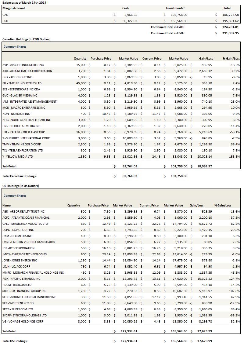 Note: Its worth noting that while I was going through this reconciliation of my larger positions, I did notice a few discrepancies (in addition to what I already mentioned with Pacific Ethanol) where the on-line portfolio doesn’t truly reflect my actual holdings. First, I own a larger percentage of Extendicare and MagicJack than is currently represented in the on-line holdings. My holdings in Extendicare are nearly double what it they are represented here, while MagicJack is 40% higher. Second, my on-line position in Vonage and ChipMos are too high. My position in Vonage is about half the size that is reflect there while Chipmos is about 2/3. From time to time I have to reconcile the practice account I use to track my portfolio with what I actually own because it tends to get out of sync. I think I will have to do that again soon.