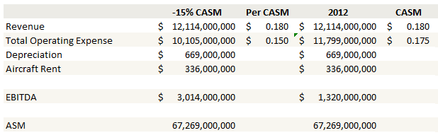 Air Canada has stated that their goal is to reduce CASM by 15% from their 2012 numbers by 2015. The table above shows you what it would mean if they can accomplish that goal.