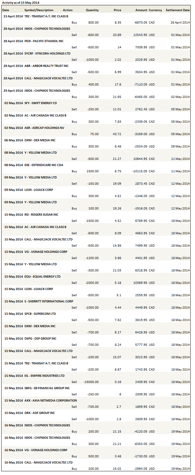 This week on Wednesday and Thursday I sold enough stock to raise about 30% cash in my portfolio. That was probably too much too fast, and on Friday I allocated some of that cash back (to Chipmos, Air Canada and new positions in King Digital and Hercules Offshore) but even so I have 20% cash level right now and I plan to increase that as opportunities arise. I also intend to be very careful about what I invest in; in particular, liquidity will be at a premium. I want to own stocks where the daily trading volume is multiples of the number of shares that I own.