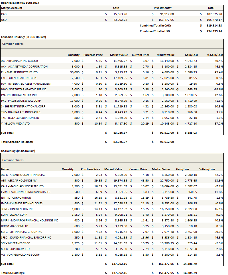 On Wednesday and Thursday I exited positions in ADF Group, Rogers Sugar, DSP Group, Dex Media, Equal Energy, New Residential and my Hovnanian preferred shares. In the prior weeks I had already exited Arbor Realty and Syncora Holdings. The number of stocks in my portfolio has been reduced significantly.