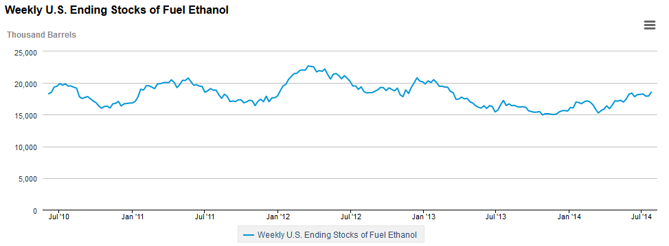 This is good news because the one thing that has me worried about my ethanol plays (while I don’t own Green Plains I have, in addition to my position in Pacific Ethanol I have taken a reasonably large position in REX American Resources Corp (REX) and in MGP Ingredients (MGPI), which I will discuss briefly below) is that the inventory is yet to fall along with the summer driving season. Here is a snapshot of the recent 5 year chart. Note that there was yet another up-tick with a build this last week after a few weeks where it appeared that ethanol stocks would begin their annual draw down.