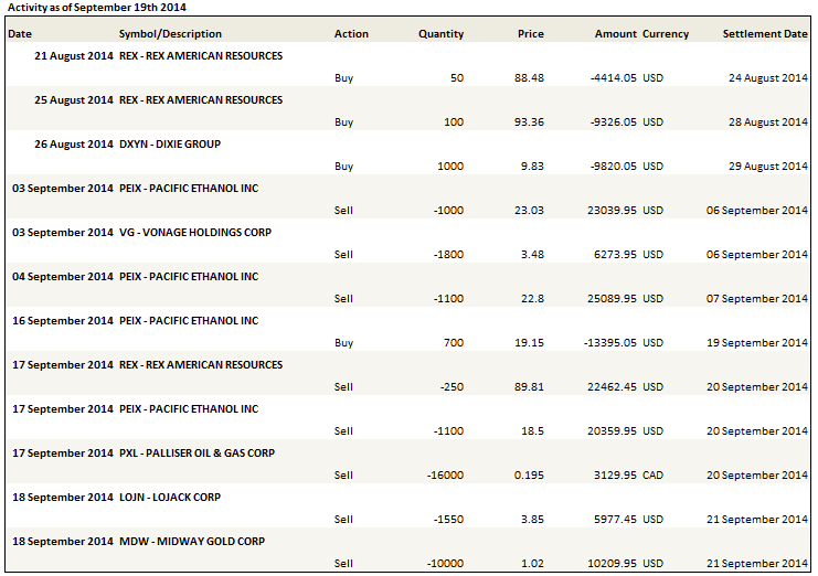 I sold out of the rest of Pacific Ethanol and Rex American Resources in the first half of this week. I hemmed and hawed through the weekend, even briefly added to my position to Pacific Ethanol on Monday (at the same time I was reducing my position in Rex American), but the volatility of the stocks, the declining price of ethanol, and specific to Pacific Ethanol, my uncertainty with respect to their corn basis (I concluded tentatively it is actually quite a bit higher than Q2) led me to capitulate on many of my shares on Tuesday. I followed that up by selling the rest on Wednesday in the minutes that followed a very bearish EIA inventory report (+800,000bbl!). I tweeted on my sales at the time.