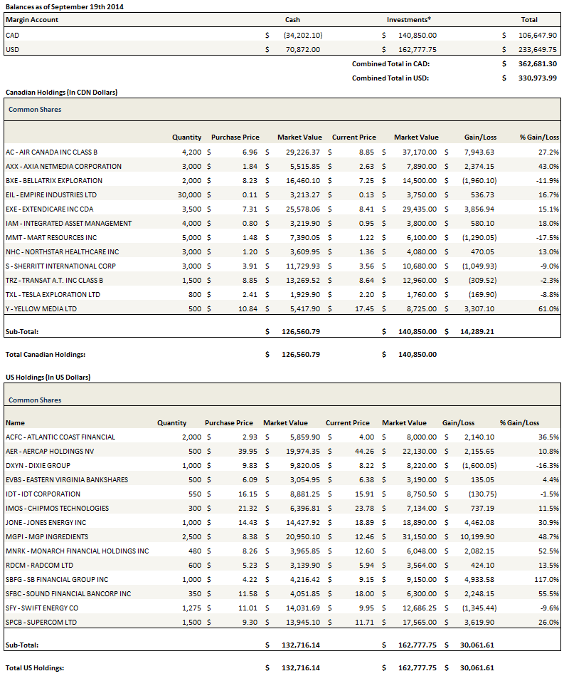 I sold out of a few stocks since my last update, of which a couple I was slower to cut losses than I should have been. First, I sold Palliser Oil and Gas, which has been an absolute disaster, with the only saving grace being that my position was not very large. The company recently announced a transaction that will infuse cash and has bumped up the share price to something a little less dismal, but when I looked at Twin Butte Energy this week, which is undoubtably a better company, it was hard to justify holding Palliser if I wanted heavy oil exposure.