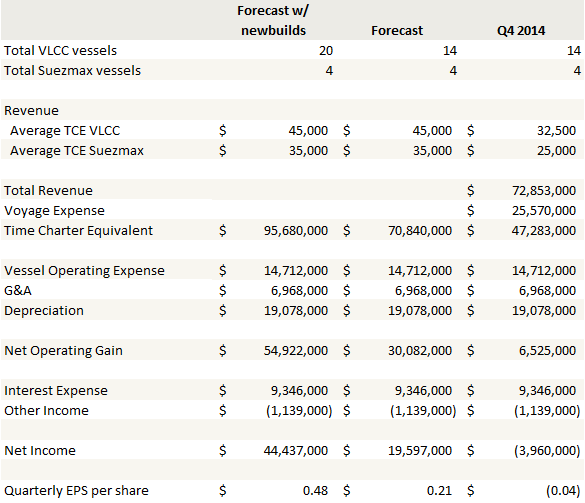 DHT has 14 VLCC tankers and another4 Suezmax tankers.  There are another 6 VLCC new builds that will be delivered over the next two years.  When I look at DHT’s earning performance at rates even slightly below today’s level, I am left to conclude there is significant upside in the stock if the thesis does play out as I expect.