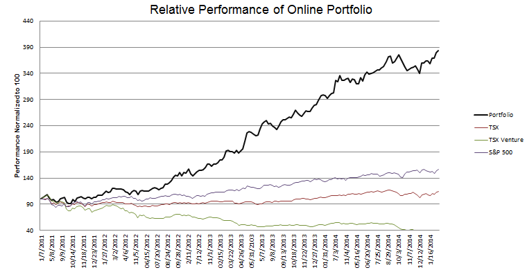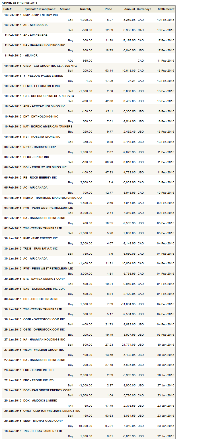As I mentioned in my last update, I had been in and out of Penn West a couple of times during the first month of the year.  I held Penn West for perhaps the last time a couple weeks ago when I bought the shares for a little under $2 (Canadian) and sold them at $2.60.  Regretfully I sold much too soon, the stock kept roaring all the way up to $3.30. But consistent with my theme this month and with the thesis I presented in my last update, the nature of my purchase was a short term scalp and to stray from the nature of my intent would have been little better than a blind gamble.