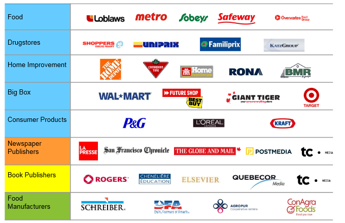 TC Transcontinental is a pretty simple story. They are the largest printer in Canada. Their printing operation is diverse and includes flyers, packaging materials, newspapers, magazines and books. Of those lines of business, the main driver of revenue is from retail flyers for customers such as Superstore and Canadian Tire. Flyers and related services make up a little over 50% of their total revenue. In addition Transcontinental owns an array of local newspaper and magazine publications in Quebec. They recently expanded into flexible packaging with the purchase of Capri. The table below illustrates the primary customers in each of their segments.