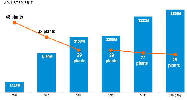 The company has made a couple of acquisitions over the last year and a half to facilitate some growth. First, in December 2013 they bought a number of Quebec local newspaper and magazine assets of Sun Media. They paid $74 million for these assets, which generate annual EBITDA of about $20 million. In April they entered into flexible packaging with the purchase of Capri for $133 million. Capri generates EBITDA of about $17 million, and 75% of revenue comes from a 10 year contract with Schreiber Foods.