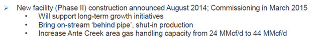 If you look at the numbers, at 10,200boe/d the volumes were 63% liquids, so gas production was about 22.6MMscfd. At 8,300boe/d gas production is now up to 48%, or about 23.9MMscfd, so even as the overall production has declined, gas production has ticked higher. And its started to hit the ceiling. According to the March presentation the facilities at Ante Creek can only handle 24MMscfd at current gas plant capacity: