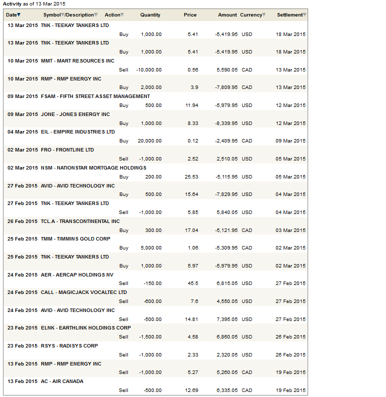 All of this came to pass when the company announced weak first quarter results. Now I still really like Transat and I am looking to add my position back, but I’m not sure we are there yet. The second quarter is likely to be just as weak as the first, and the Canadian dollar just keeps on falling. The summer though will be stronger, they will benefit from the weaker Euro and the fuel hedges will begin to run-off. At some point there is a buy here, but I haven’t jumped in yet.