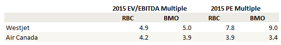 Air Canada trades at a discount to WestJet on both and EBITDAR and EPS basis, but the discount is far greater with regard to the latter because of the leverage that Air Canada employs.  Air Canada has about $5.5 billion of net debt while Westjet debt is  around $1.1 billion.