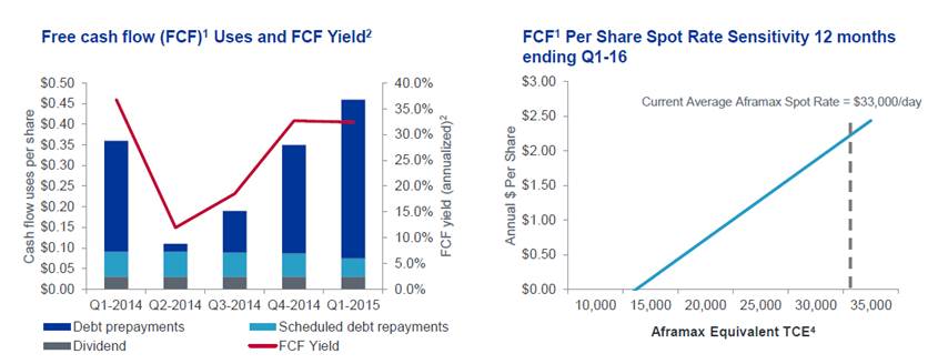 freecashflowThe company’s cash flow increases by 57 cents for every $5,000 increase in day rates.  Its extraordinary leverage.   Now albeit their definition of “free cash” is a little suspect – free cash for tankers is basically, “we’ve bought all our ships and don’t plan to buy any more”.  But nevertheless a cash flow multiple  of 3x, when that cash will go straight to the balance sheet in one form or another absent further ship purchases, seems inexpensive to me.