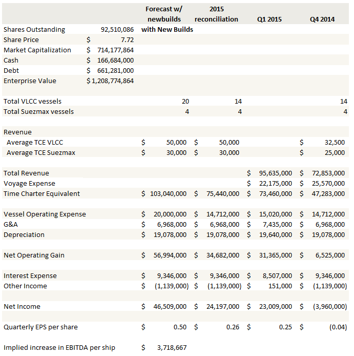Take a look at my model below.  Those 6 additional ships, delivering $3.7mm of EBITDA at $50,000 day rates, are going to double earnings to around 50 cents per share quarterly.  This is comparable on a per share basis to Euronav, yet Euronav trades at $13.