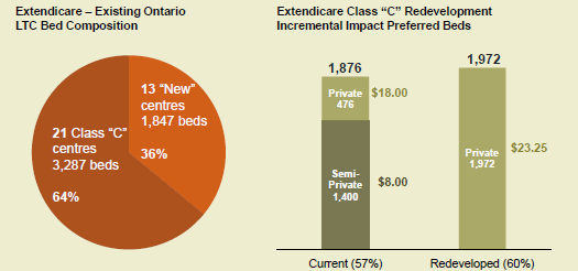 Perhaps most importantly, the Ontario government amended its subsidies for redevelopment at the of February.  The base subsidy for large homes was increased to $162,000 per bed from $121,000 per bed over a 25 year life.  Also the revised design standards no longer include LEEDs certification, which should bring down construction costs.  Below is the outcome of Extendicare converting 1,876 of its Class “C” beds (the lowest type) into 1,972 Class A beds.