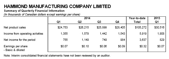 Taking the what they do statement right from their MD&A: “Hammond Manufacturing Company Limited manufactures electronic and electrical enclosures, outlet strips and electronic transformers that are used by manufacturers of a wide range of electronic and electrical products. Products are sold both to OEM-direct and through a global network of distributors and agents.”  Simple business. No real moat.  But the type of business that can see a very positive impact from a change in their cost structure such as that brought on by the current weakness in the Canadian dollar.