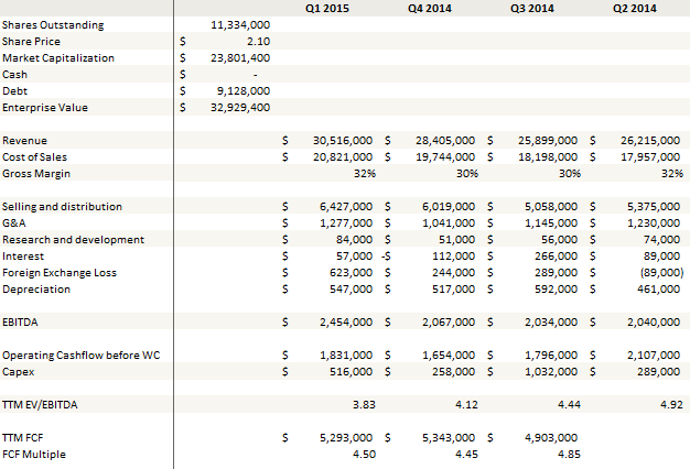 The stock has so far been a bit of a disappointment.  They had a great quarter on the top line – revenue was up to $30.5mm from $24.5mm in 2014, which is inline with my thesis that they would be one of the manufacturers to benefit from the lower Canadian dollar.  The revenue gain was partially due to foreign exchange gains and partly due to market share gains.