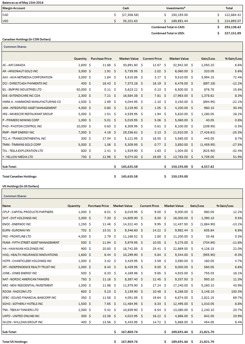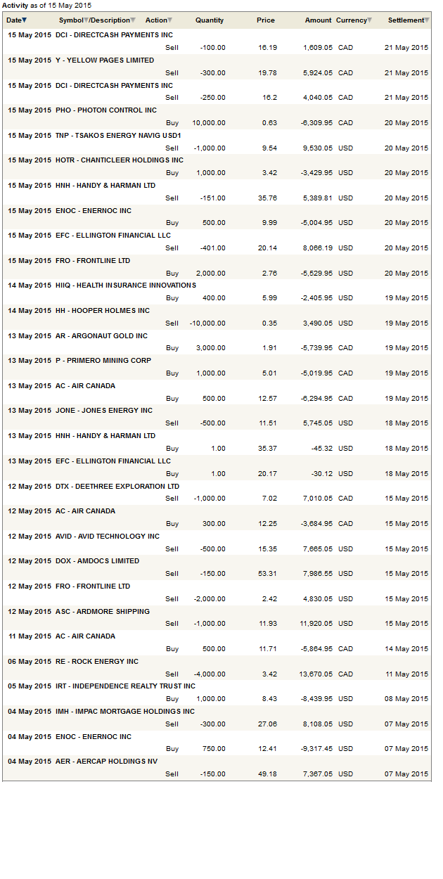 I made this my largest holding after first quarter earnings were announced.  Air Canada continues to get very little respect from the investor community.  With estimates that top $3 for the full year 2015, the stock trades at around 4x earnings.