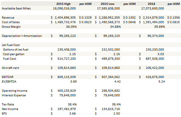 I think Hawaiian is cheap in the low $20’s. A move above $25 and I look to lighten up as I did earlier this month. Below is my 2015 earnings estimate based on the company’s high and low guidance. All of the inputs come directly from guidance with the exception of RASM, which I estimated as -2% year over year on the high side and -4% year over year on the low side.