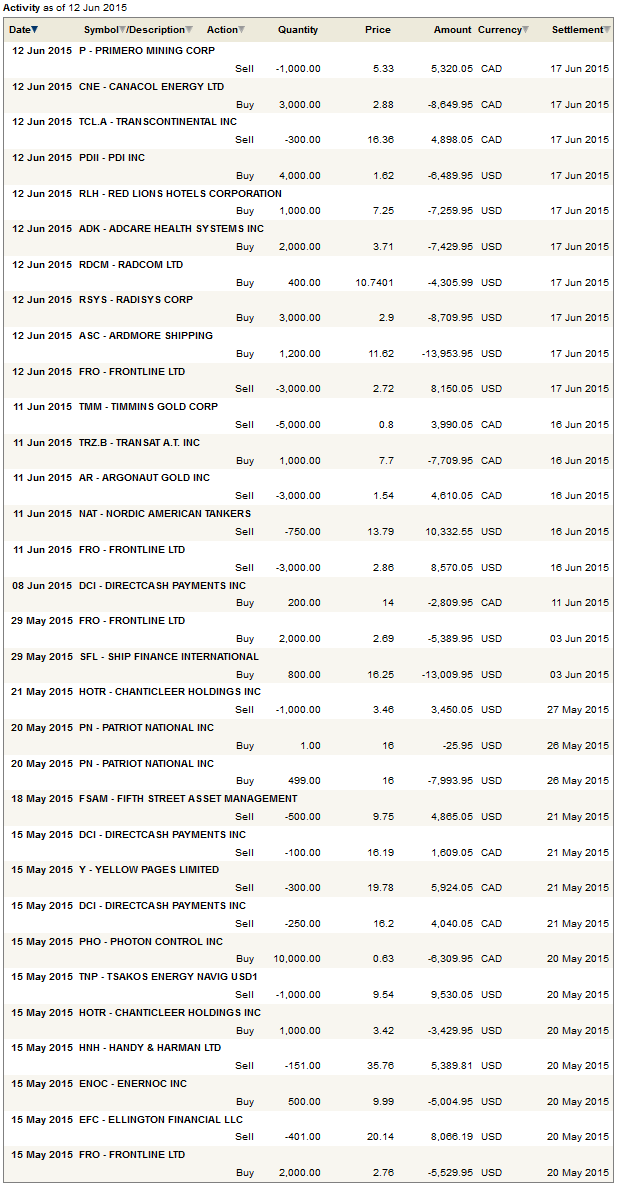 I haven’t done a clean-up in a while and so when I finally on Friday I noticed I was missing a number of positions that should be included. Thus I added Canacol Energy, Red Lion Hotels, Adcare Health Systems, Radisys, and Ardmore Shipping. Fortunately with the exception of Radisys and Red Lion none of the other positions had moved significantly from my actual purchase level. I bought Radisys at a little over $2 and Red Lion at around $6.25 so I did miss out on some gains there. But in the grand scheme of things the differences are minimal and now the tracking portfolio for this blog is much more closely aligned with my actual positions.