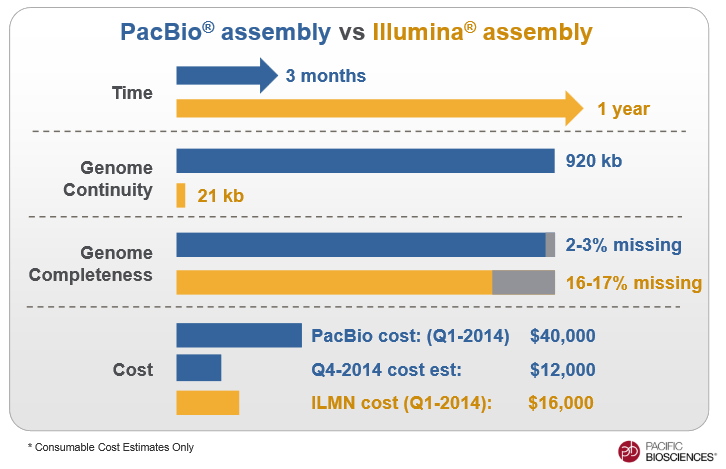 What seems to set Pacific Biosciences apart from Illumina is that their technology produces much longer gene sequencing strings which results in far lower error rates. Below is a comparison between the two.
