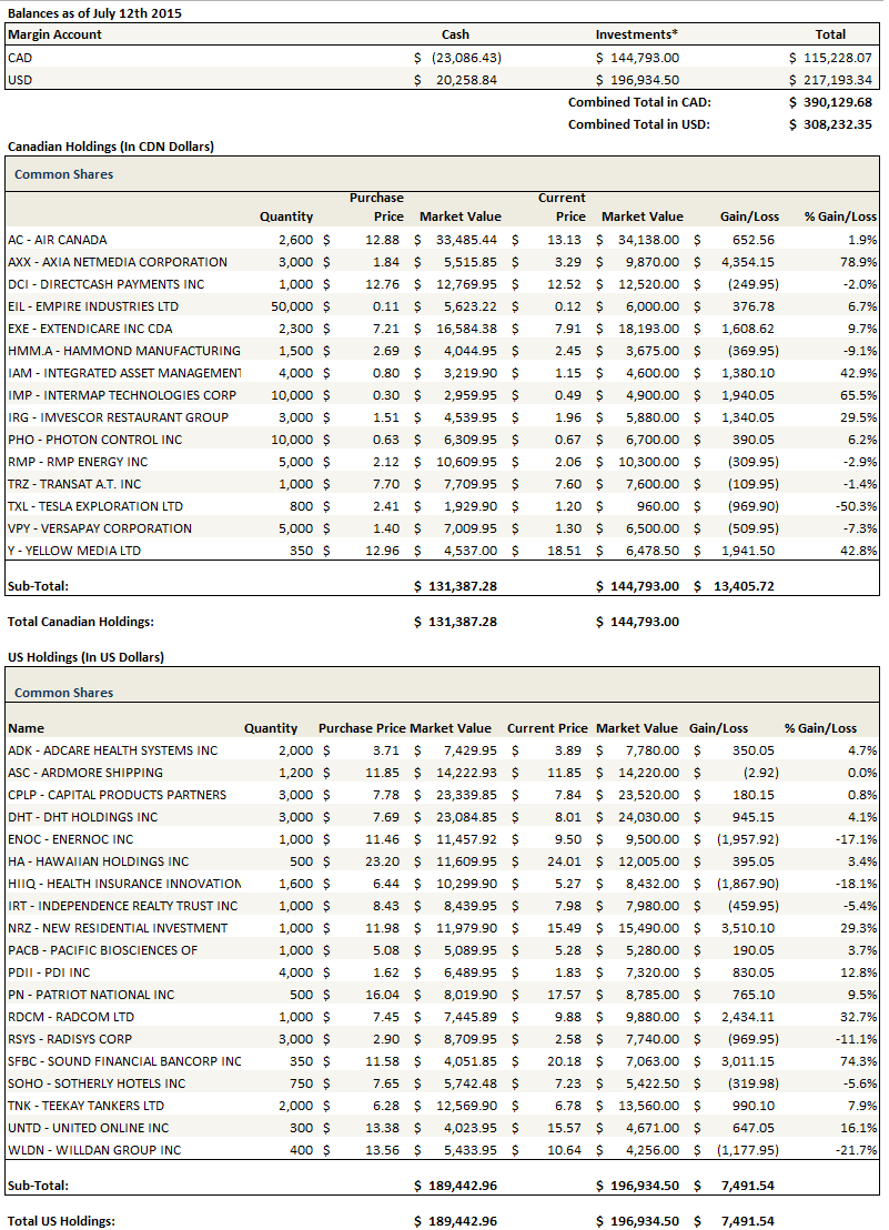 In my online portfolio, in which I cannot short, I sold out of my gold mining shares, my oil stock shares, some of my tanker shares (Euronav and Frontline), a hotel play (Red Lion), reduced my airline exposure in both Air Canada and Hawaiian Holdings as well as my Yellow Pages and Enernoc positions.