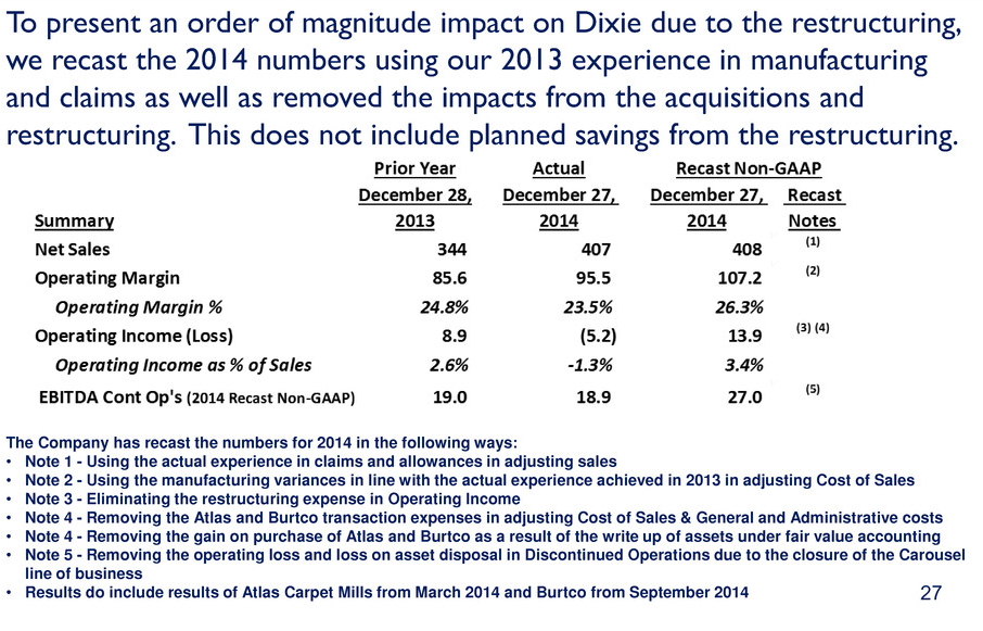 In their third quarter earnings presentation Dixie presented the following pro-forma to restructuring 2014 earnings.