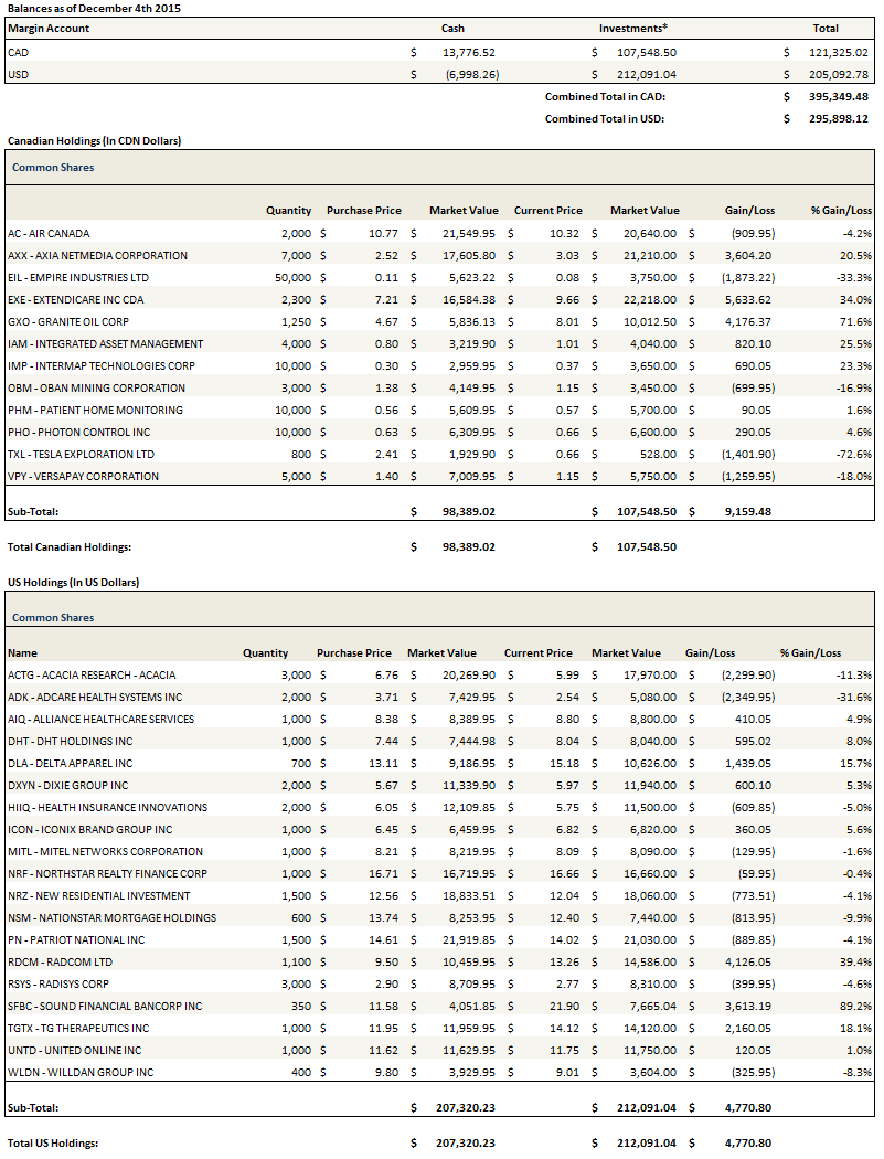 I didn’t make a lot of trades this month. I added a couple of beaten down stocks (Dixie Group and Iconix Brands), added to a couple of existing beaten down positions (Acacia Research and Health Insurance Innovations), added to a less than beaten down position (Axia NetMedia) and sold out of a few poorly performing positions in PDI Inc, Nevsun, Independence Realty and Hammond Manufacturing. I also reduced two of the three out-sized positions that I talked about in my last update, New Residential and DHT Holdings on pops. At this point the only really uncomfortably large position I have is in Air Canada, a stock that seems to do nothing but go down.