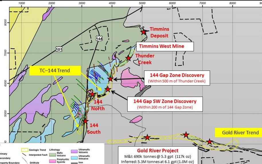 Lake Shore operates two gold mines in Ontario.  The Timmins West Mine is 18km west of Timmins.  Lake Shore produces from two deposits: Timmins and Thunder Creek.  The trend is ripe for new discoveries and there have been a couple with the 144 Gap Zone and 144 West Gap Zone.  Below is a schematic of the four deposits.
