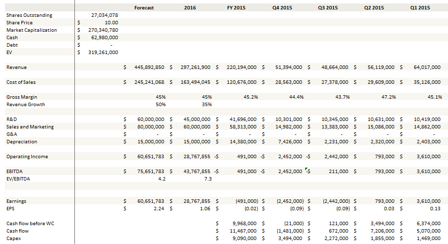 While they declined from giving guidance (historically the company has given virtually no guidance in the past so this was no surprise) they were willing to say that they expected their cash level to increase to $20 million from current $9 million by end of the first half of 2016, and that the increase in cash would be due to new revenue and not deferred payments.