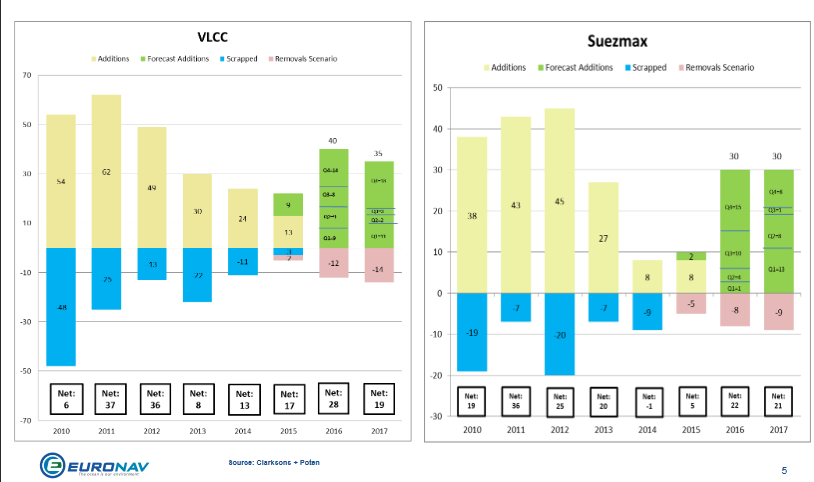 Note that since that time the gross additions for Suezmax have fallen by 3 in 2016 and risen by 15 in 2017, while gross additions have risen by 5 in 2016 and 5 in 2017 for VLCCs.