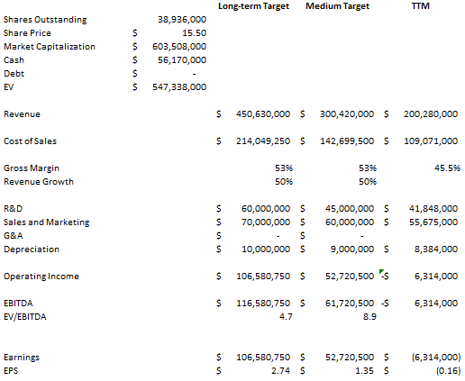 I’m accepting management’s comments that operating expenses are dominated by headcount, that they don’t expect this to scale with the top line increases, and that most of top line growth will drop to the bottom line. I’m also assuming that management’s assertion that gross margins can transition to the low 50%’s by the end of 2017 is correct. And my long-term target is a little over 2x revenue, not 3x revenue.
