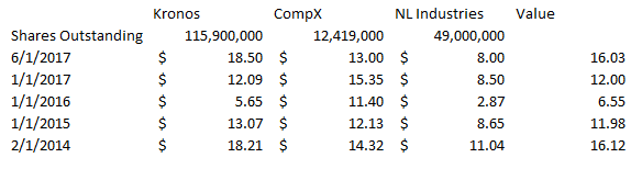 Keeping that in mind, when I look back at the stock price of NL Industries, Kronos, and CompX over that time, I notice that the current relative price is close to the bottom of the relative range of NL Industries. To throw out a few data points: