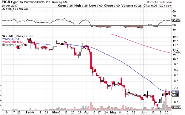 I bought Eiger Pharmaceuticals back in February at $11. As the chart below shows, its been a painful slide since then.